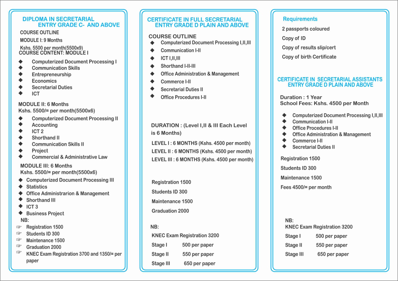 SCHOOL OF SECRETARIAL STUDIES CAREERS IN SECRETARIAL & OFFICE ADMINISTRATION Administrative AssistantSecretaryPersonal Assistant (PA)ReceptionistOffice AdministratorRecords Management AssistantCustomer Service RepresentativeOffice ClerkData Entry ClerkFront Desk Executive Human Resource AssistantVirtual AssistantExecutive AssistantOffice SupervisorFiling ClerkOffice MessengerDocument ControllerCall Center AgentAdministrative Support OfficerTypist / Word Processor
